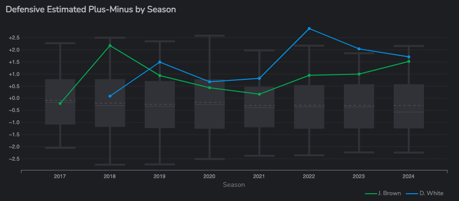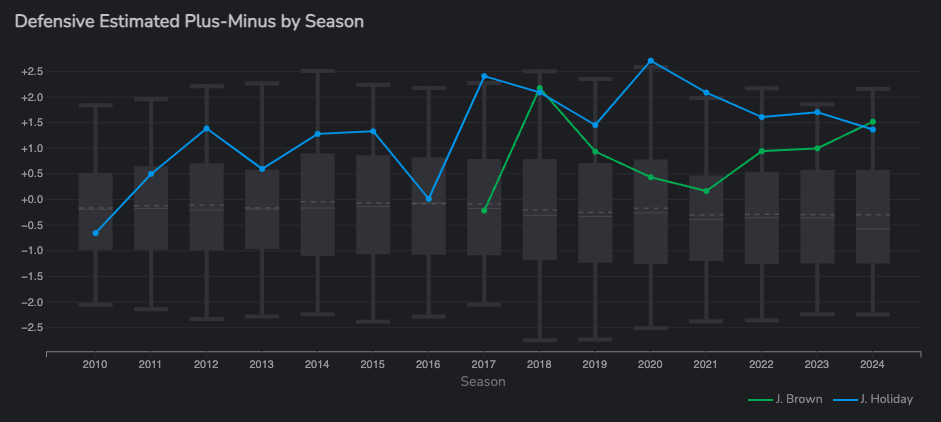 Interstingly, Brown ranked marginally higher than Holiday in Defensive Estimated Plus/Minus.