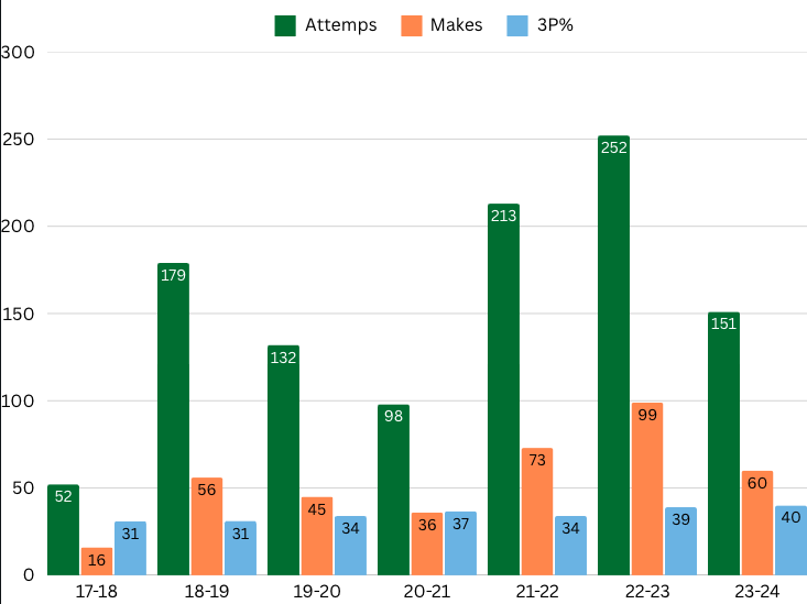 🗣️ My Take: I found the tidbit about Torrey Craig quite interesting, so I went back and looked at his shot profile in terms of frequency and accuracy over his career. Here’s how his three-point attempts look in graph form.