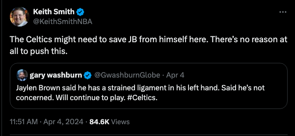 Now, Brown might not want to sit out. As posted on Twitter — sorry, I mean X — this may be a case of Boston saving one of their stars from himself.