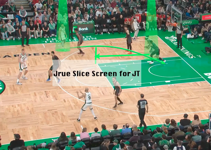 The play above is Boston’s core in-bounds play, known as a “Slice” action — we looked at these in detail a few months back.