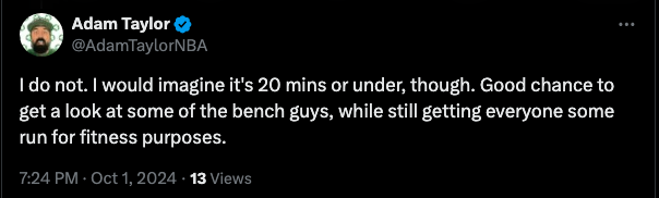 The starters played all 12 minutes of the opening quarter. Mazzulla clearly wanted to knock some of the cobwebs off. It’s also an excellent way to jolt their cardio and get them used to playing while tired. I liked it. He also kept the starters under 20 minutes, a prediction I made a few days before the game.