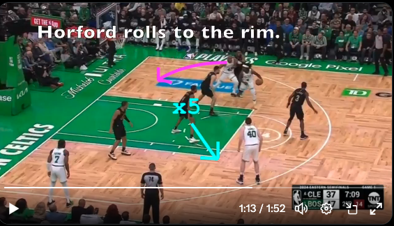 Furthermore, as the big rotate to defend the rim, they’re leaving a big open, which can lead to kick-outs or secondary cuts, like this one from Kornet in game five vs. Cleveland.