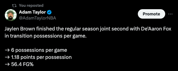 Brown ended the 2023-24 regular season joint second in transition possession per game. He and De’Aaron Fox ran the break six times per night on average. Giannis Antetokounmpo led the league with 6.3 transition possessions per game.