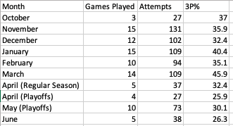 As you can see by the above chart, Tatum’s overall scoring throughout the regular-season was solid. Things only began to falter once April started. Those struggles continued into and throughout the Olympics.