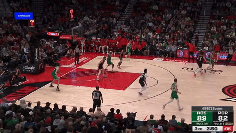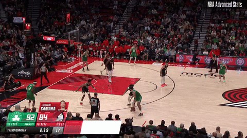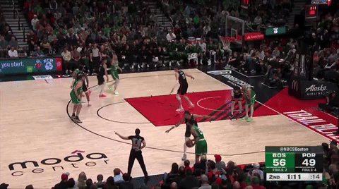 The Celtics run a basic zoom action,1 which Kornet slips upon initiating the hand-off. White finds him on the high entry pass. The Trail Blazers do a great job of crowing him on the catch, so, as soon as Kornet’s feet touch the ground, he fires a pass to Hauser in the corner.