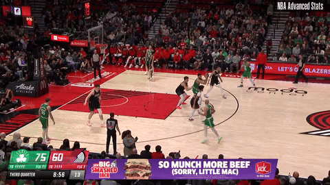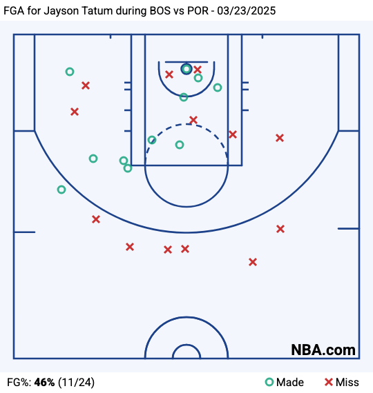 This was Tatum’s shot chart from the Trail Blazers game. Clearly, he didn’t have it going from deep. However, in the absence of Porzingis, Tatum took it upon himself to work out of the post, either by ducking in after setting a screen or cutting off a screen to attack a mismatch.