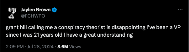 The Tea: The war of words between Jaylen Brown and Grant Hill continues to heat up. During a recent appearance on “The Dan Patrick Show,” Hill had discussed Brown being left off Team USA’s roster, noting how there’s an idea that the Celtics star’s omission is a conspiracy theory.