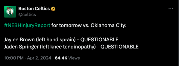 Mazzulla has been pretty consistent in his resting policy since the Celtics secured the top seed in the Eastern Conference. As such, it wouldn’t be a massive surprise if he decided to sit one or more of his primary rotation. However, judging by the team’s current injury report, the only major question mark heading into the game is Brown, who is currently listed as questionable.